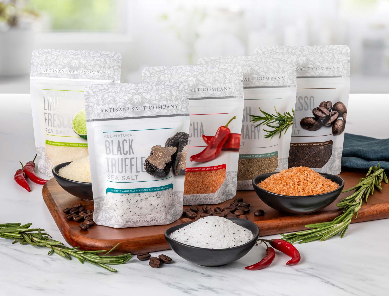 We offer an array of Fusion® Flavored Salts, from spicy Sriracha to zesty Lime Fresco, and cold-smoked, additive-free Perfect Smoke® Salts.